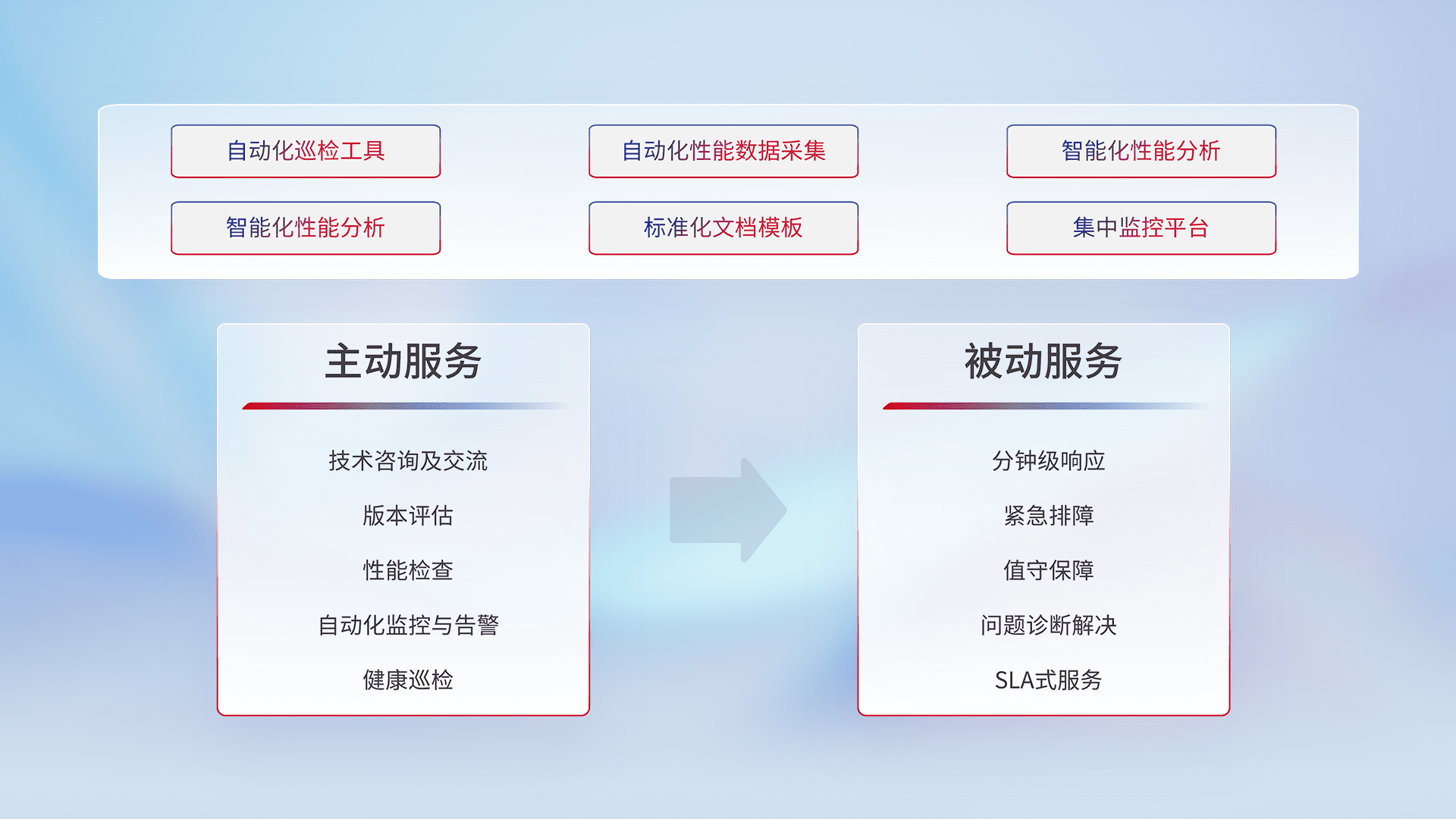 智能化工具和标准化文档,,,,保障服务质量,,,,提供主动服务(包含技术咨询、、版本评估、、性能检查、、、、自动化监控与告警、、、健康巡检)和被动服务包含(分钟级响应、、紧急排障、、值守保障、、、问题诊断解决、、、SLA服务)。。。。